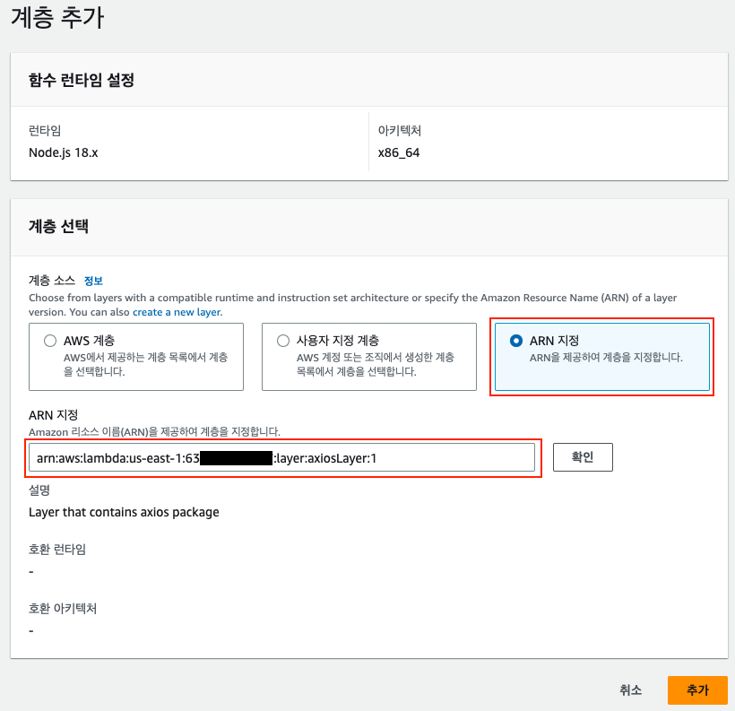 4. ARN 지정 선택 후 복사해 놓은 계층 ARN 값을 입력하여 확인 버튼 클릭 후 추가 버튼 클릭