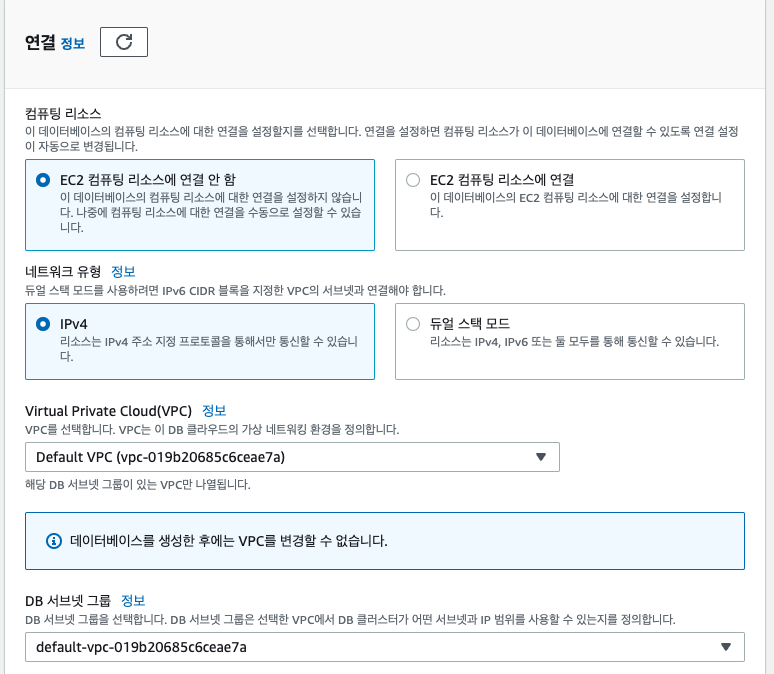 - DB 서브넷 그룹 : VPC를 따로 지정하지 않았을 경우 Defalut 값 지정