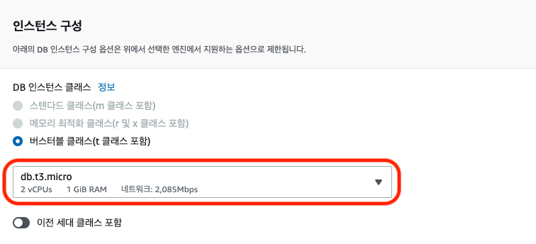 - DB 인스턴스 클래스 성능에 따라 요금이 달라진다. (프리 티어의 경우 db.t3.micro 혹은 db.t4g.micro 만 적용된다.)