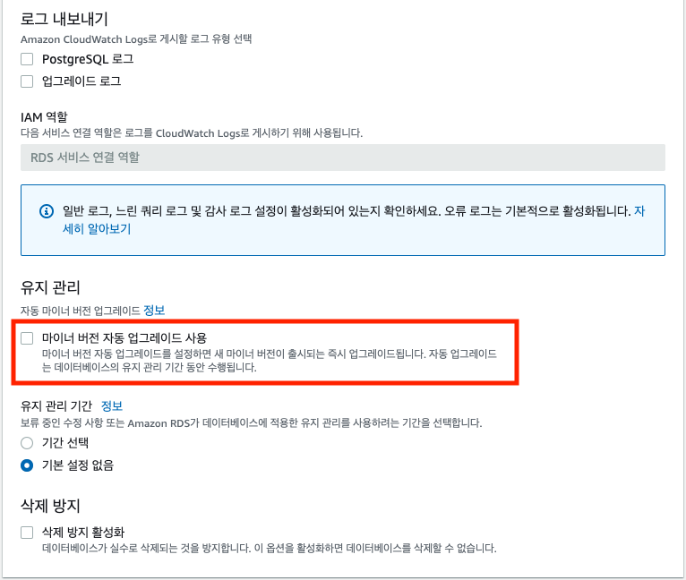 - 마이너 버전 자동 업그레이드 사용 : 업그레이드 시 약 30분 정도 간 정지되기 때문에 원치 않을 경우 체크 해제한다.
