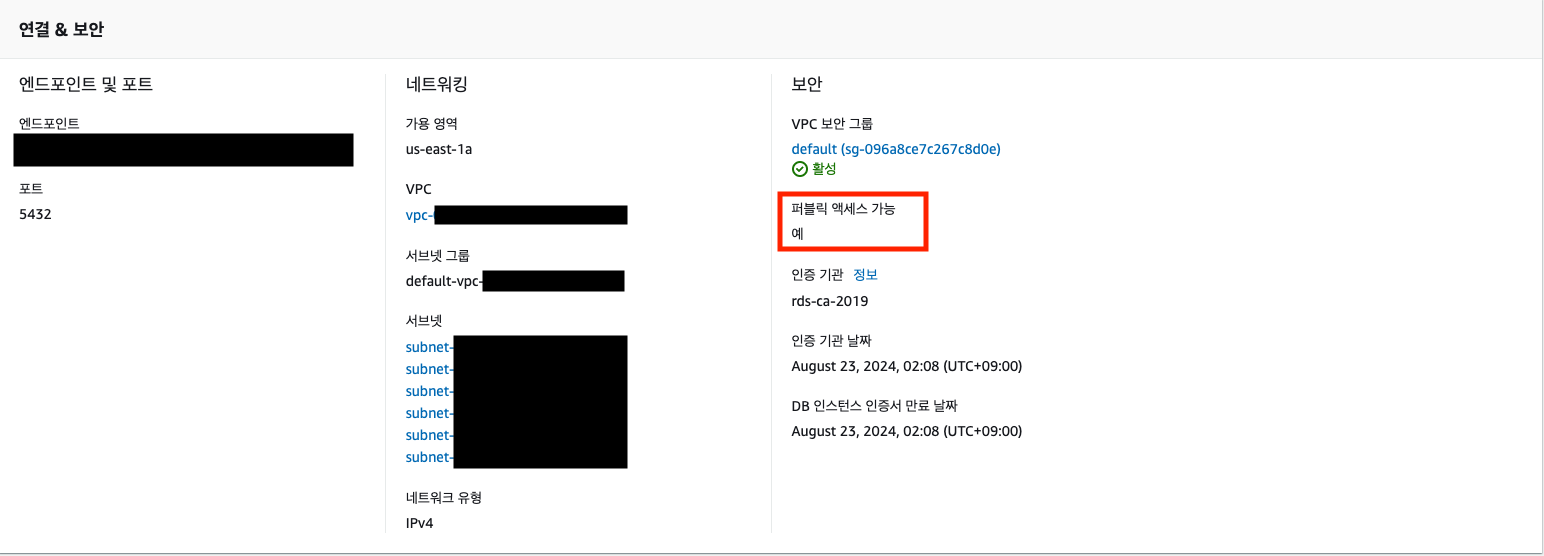 - 퍼블릭 엑세스 : 외부에서 데이터베이스를 연결하길 원할 경우 '예' 선택 (Ex. DBeaver 연결) ☆중요☆