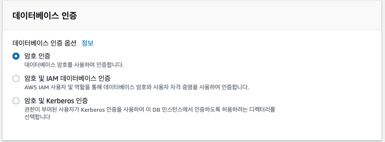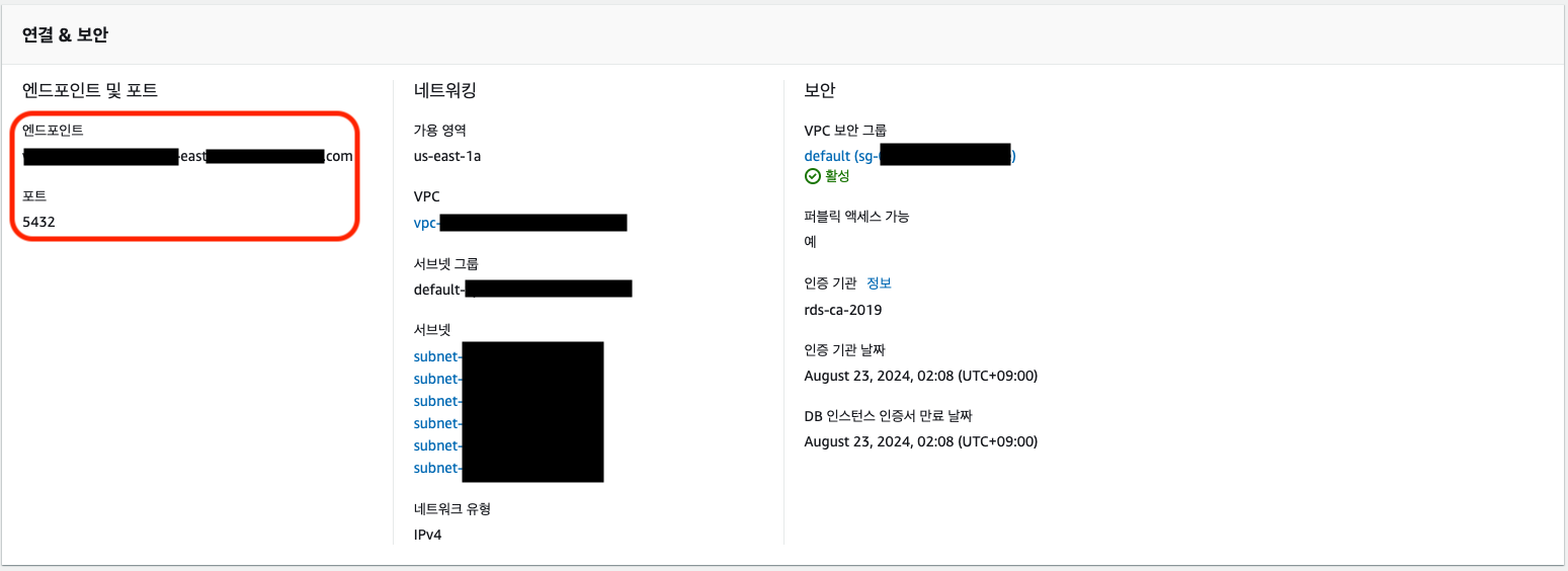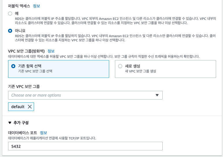 - 데이터베이스 포트 : Defualt로 데이터베이스 엔진의 기본 포트로 설정되어 있음