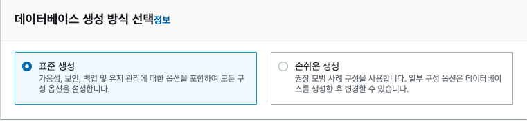 - 손쉬운 생성 : 기본 옵션(권장 옵션)이 지정되어 있어 DB 인스턴스 식별자, 마스터 사용자 계정 정보만 지정하면 된다.