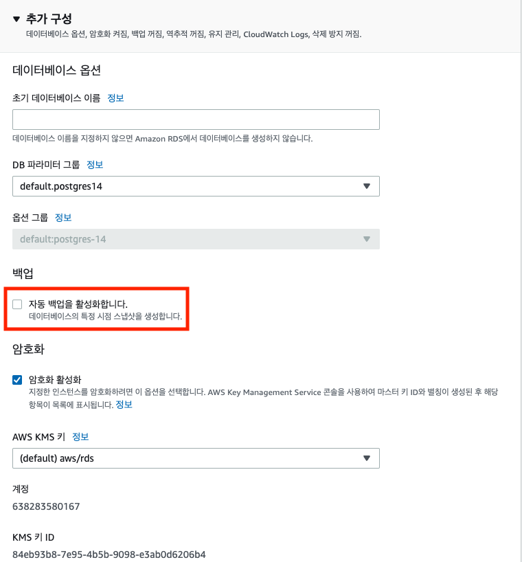 - 백업 : 백업 설정에 따라 요금이 변경된다. (과금 요소이기 때문에 원치 않을 경우 체크 해제한다.)