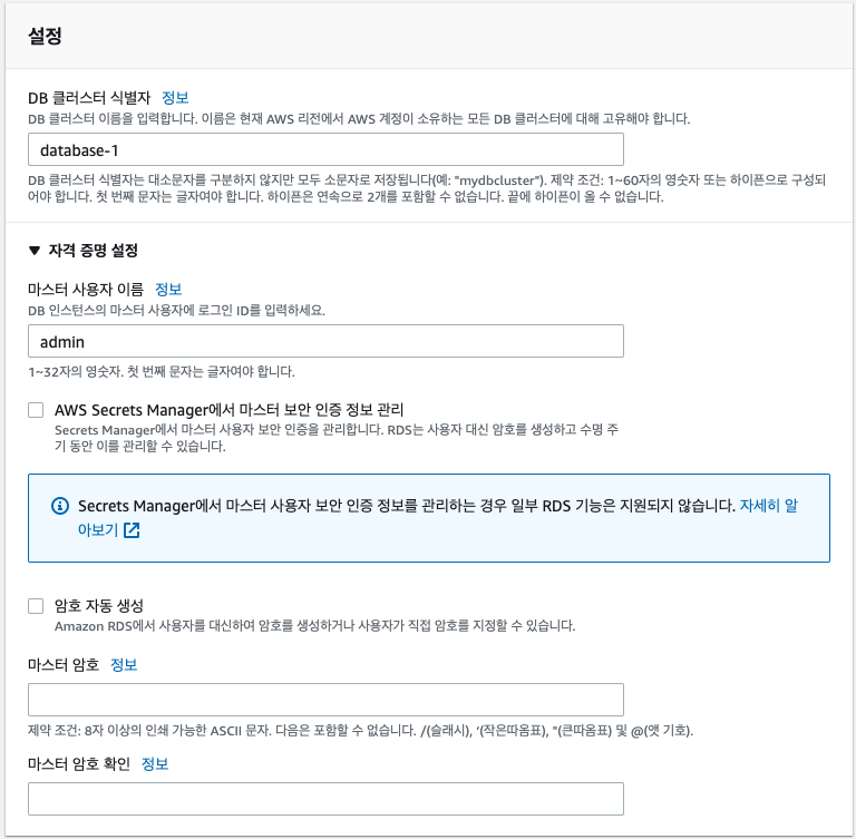 - DB 클러스터 식별자 : AWS 리전에서 AWS 계정이 소유하는 모든 DB클러스터에 대해 고유해야한다.