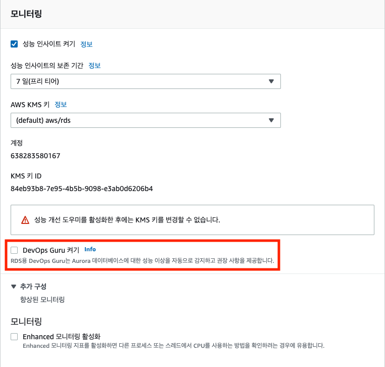 - DevOps Guru는 요금이 부과되기 때문에 배포용 DB가 아닌경우 끄는 것을 권장한다.