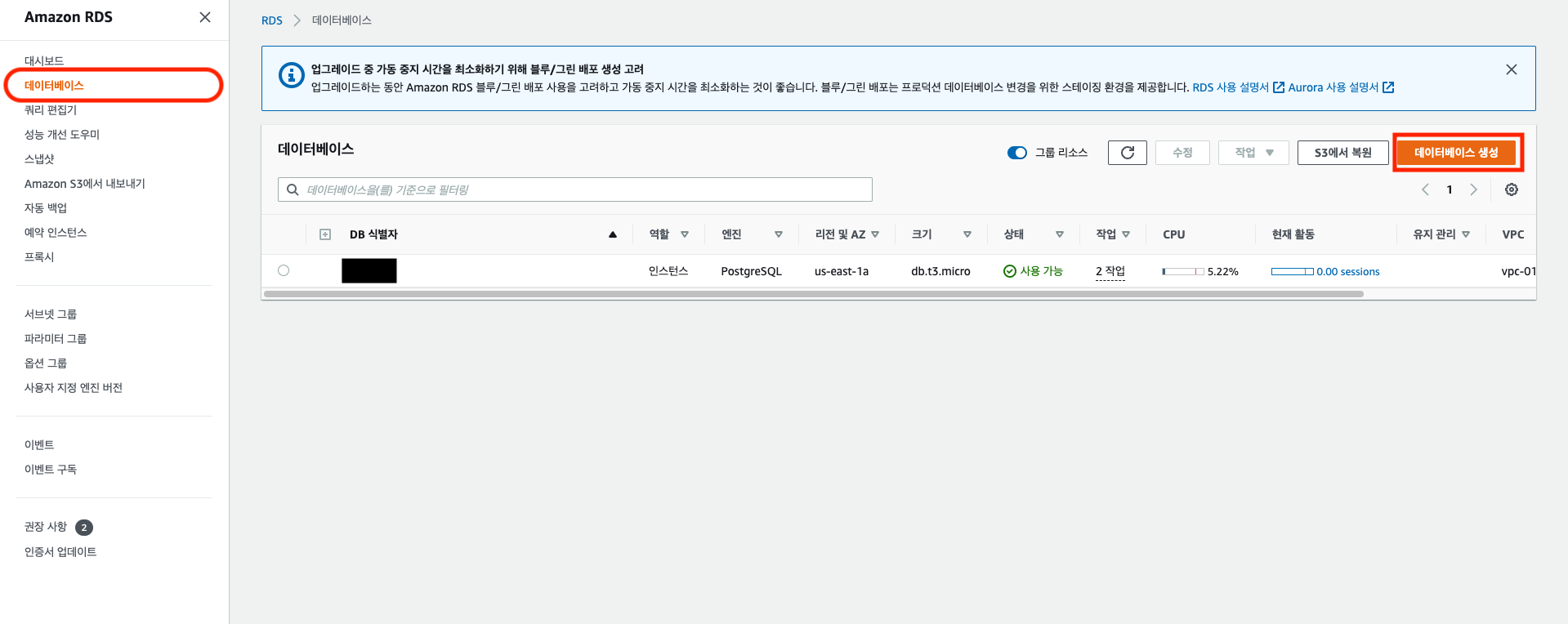 - RDS의 '데이터베이스' 메뉴 선택 후 '데이터베이스 생성' 버튼 클릭