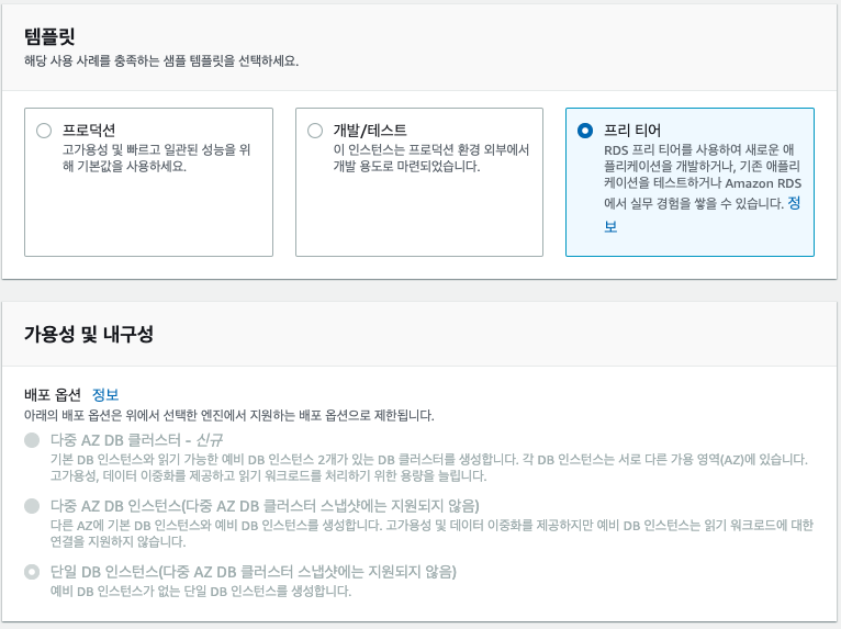 - 프리티어를 제외하고 프로덕션, 개발/테스트 템플릿에는 가용성 및 내구성의 배포 옵션을 선택할 수 있다.