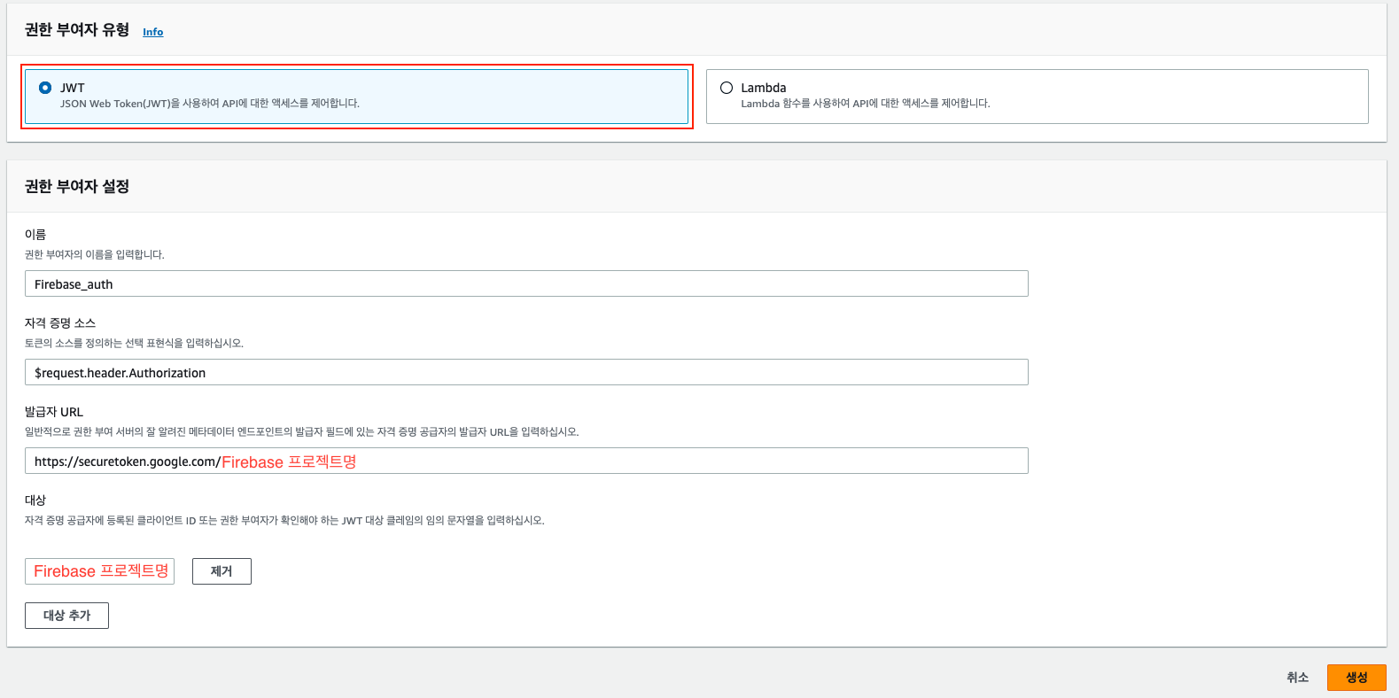 - 발급자 URL : Firebase일 경우 https://securetoken.google.com/{Firebase 프로젝트명} -> 본인이 생성한 Firebase 프로젝트명을 작성하여 URL을 입력한다.