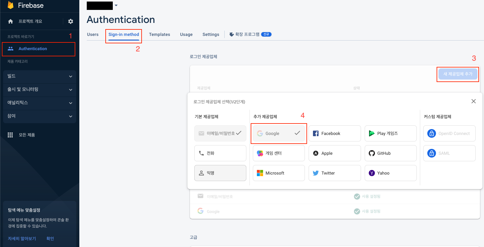 - https://console.firebase.google.com/project Project를 선택하여 Authorization 추가 제공업체 선택
