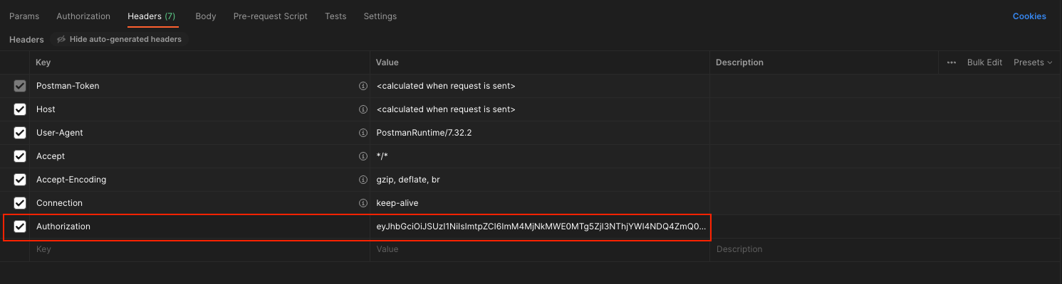 - Headers에 Authorizaion(Key)/JWT 값(Value) 입력 후 Request