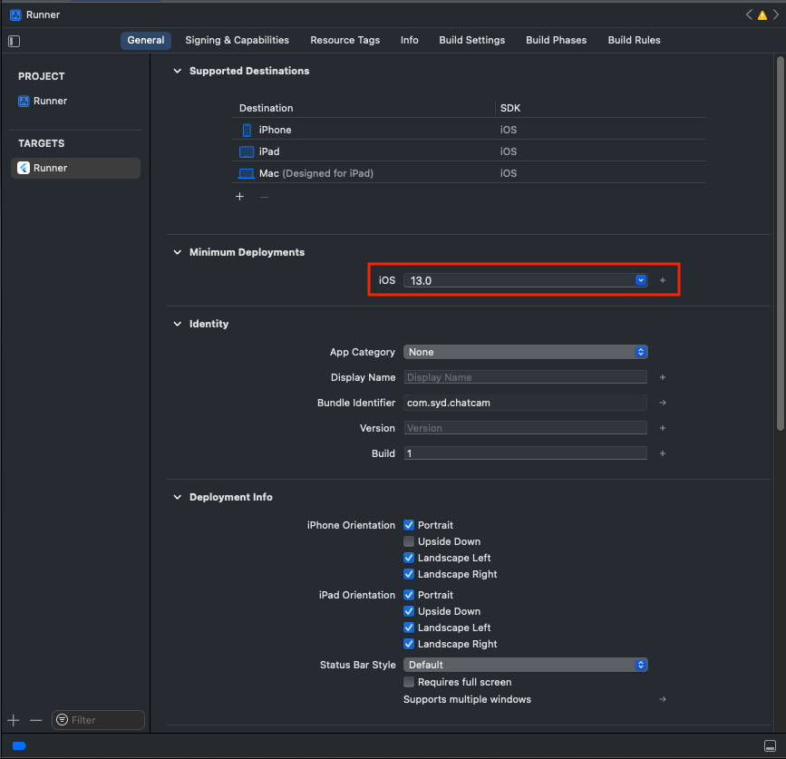- TARGETS → General → Minimum Deployments 의 iOS 값을 최소 지원 iOS 버전으로 지정한다.