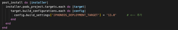 - Podfile 파일에 config.build_settings['IPHONEOS_DEPLOYMENT_TARGET'] = '(최소 지원 iOS 버전)' 을 추가해준다.