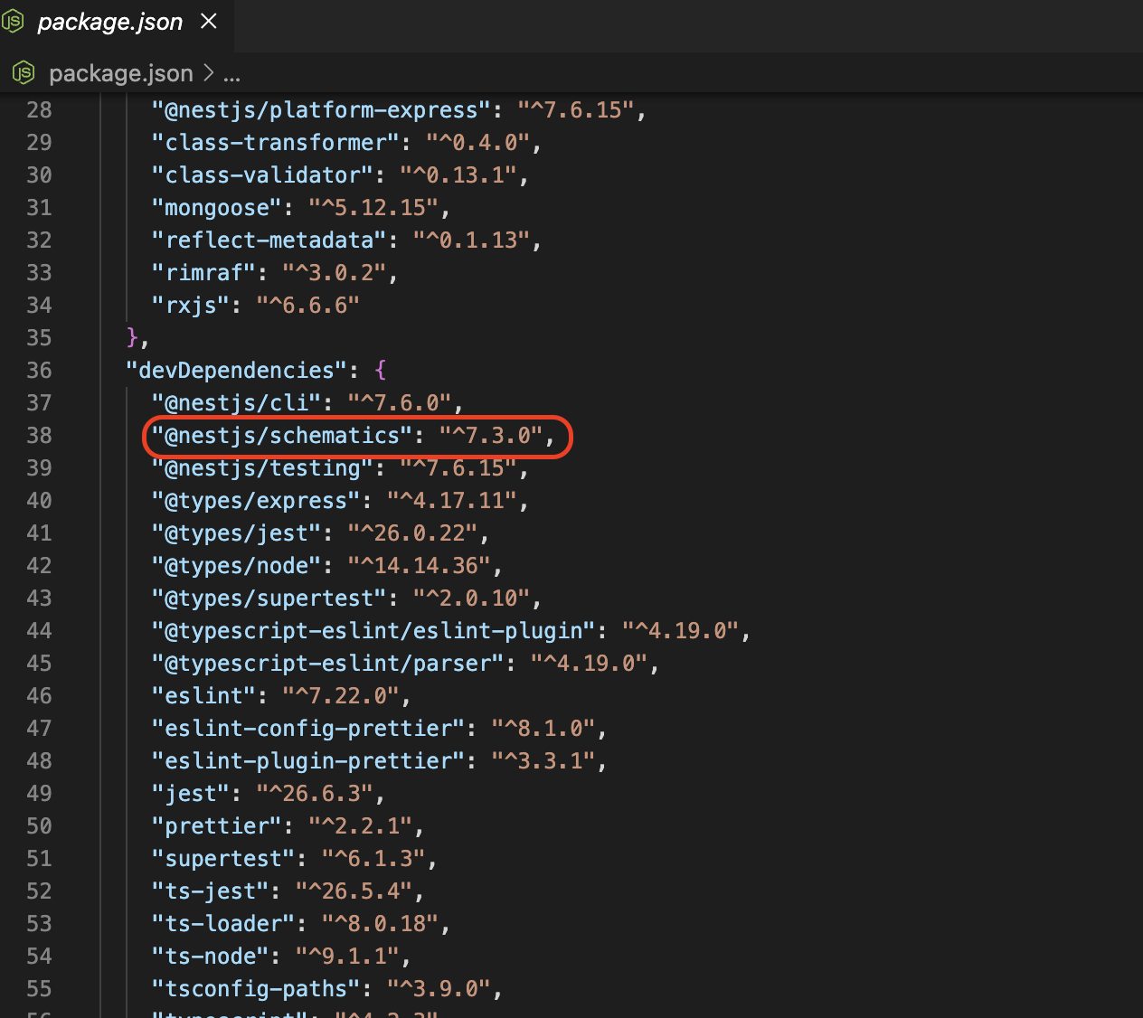 최종적으로 'package.json'에서 '@nestjs/schematics' 을 최신 버전으로 변경 후 패키지를 다시 설치하니 정상 작동하였다.