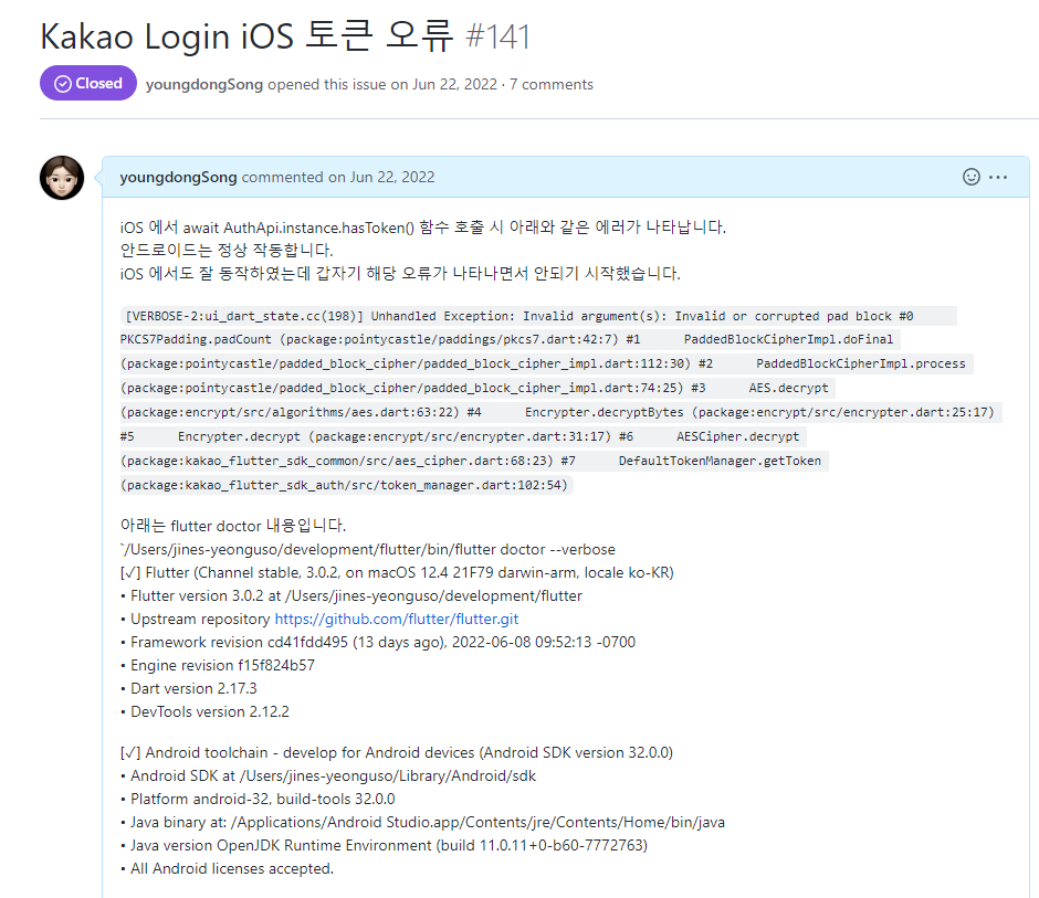 - Flutter 이슈 등록시 에러 내용과 flutter doctor로 출력된 내용을 함께 입력하는 것이 국룰이다.