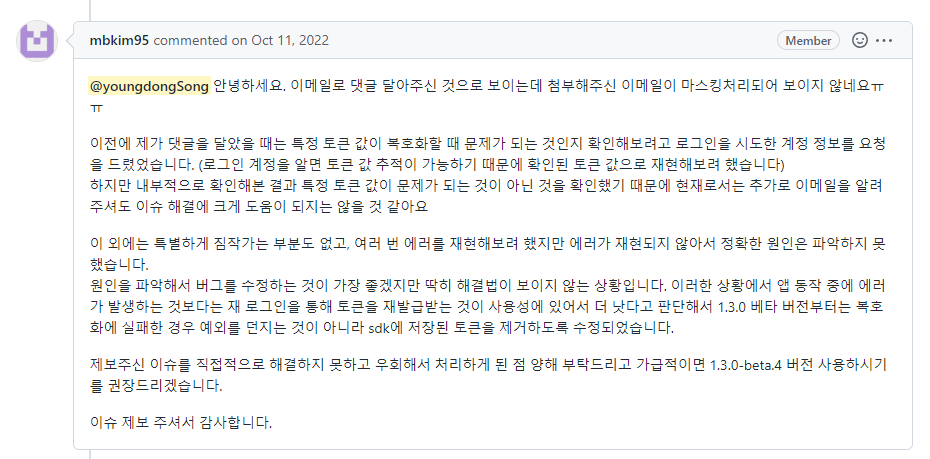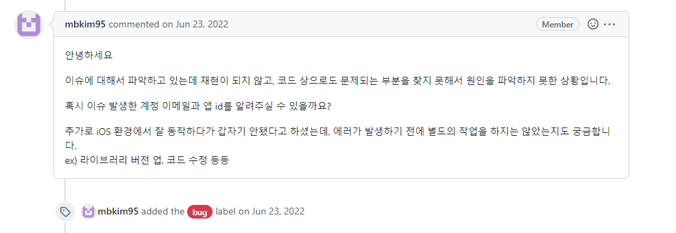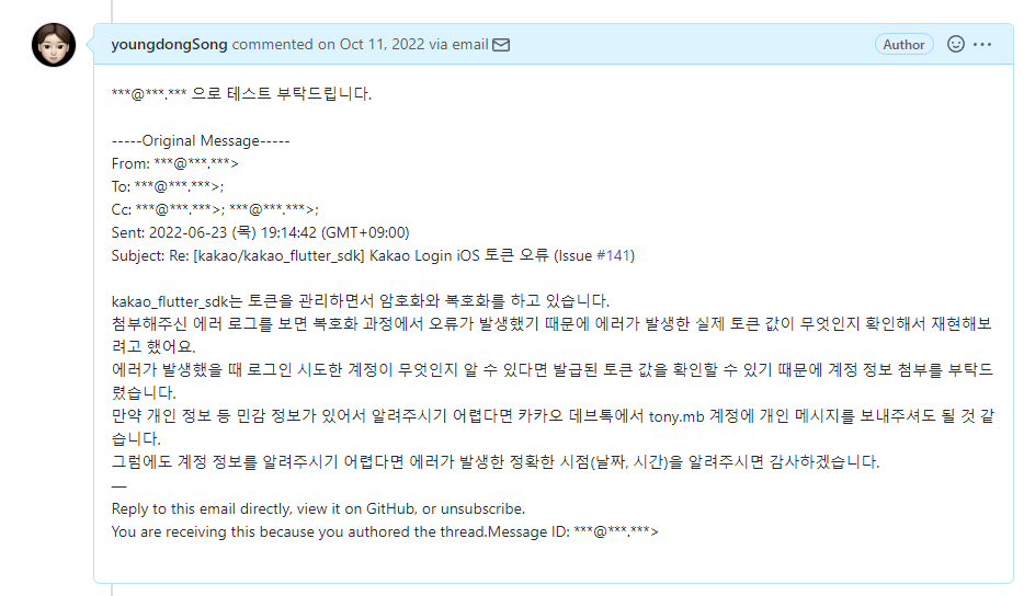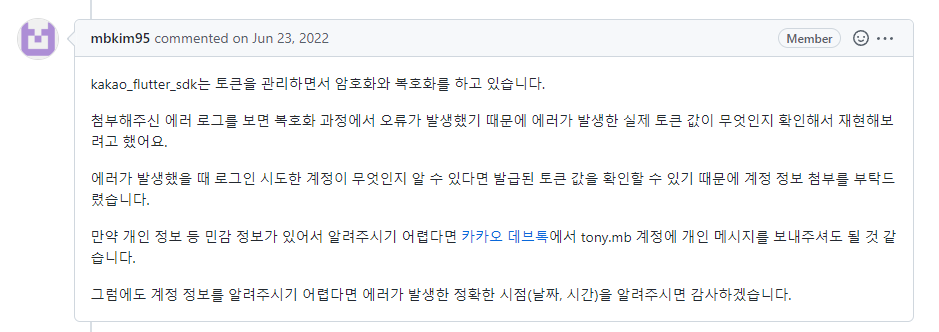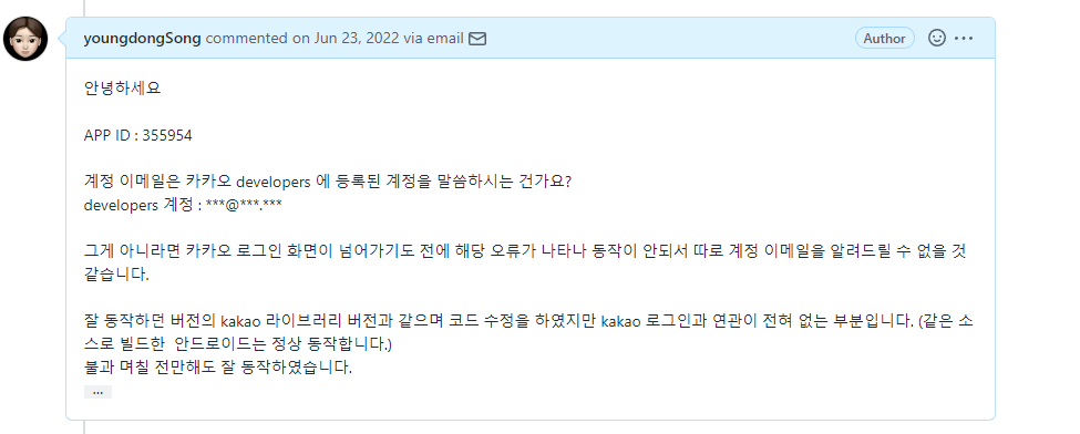 - 이슈 등록 후 하루 뒤에 카카오 담당자에게서 답변이 등록되었다.