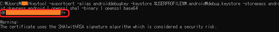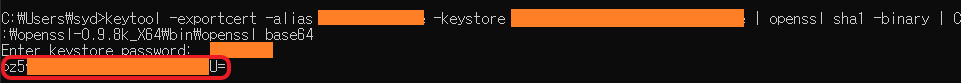 keytool -exportcert -alias [key alias] -keystore [key store 경로] | openssl sha1 -binary | [openssl 경로]\bin\openssl base64