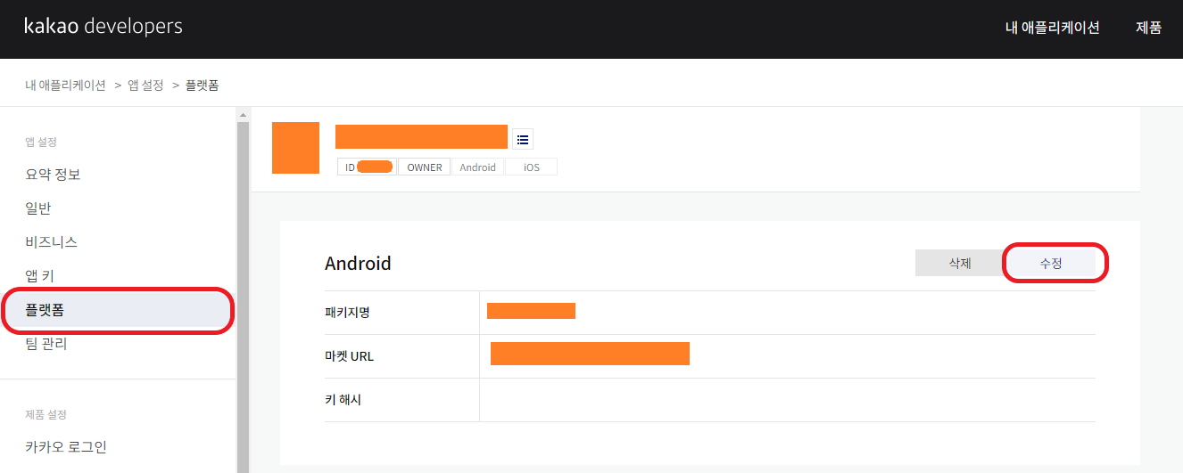 - [Kakao Developers 로그인] > [내 애플리케이션] > [애플리케이션 선택] > [플랫폼] > [Android 수정]