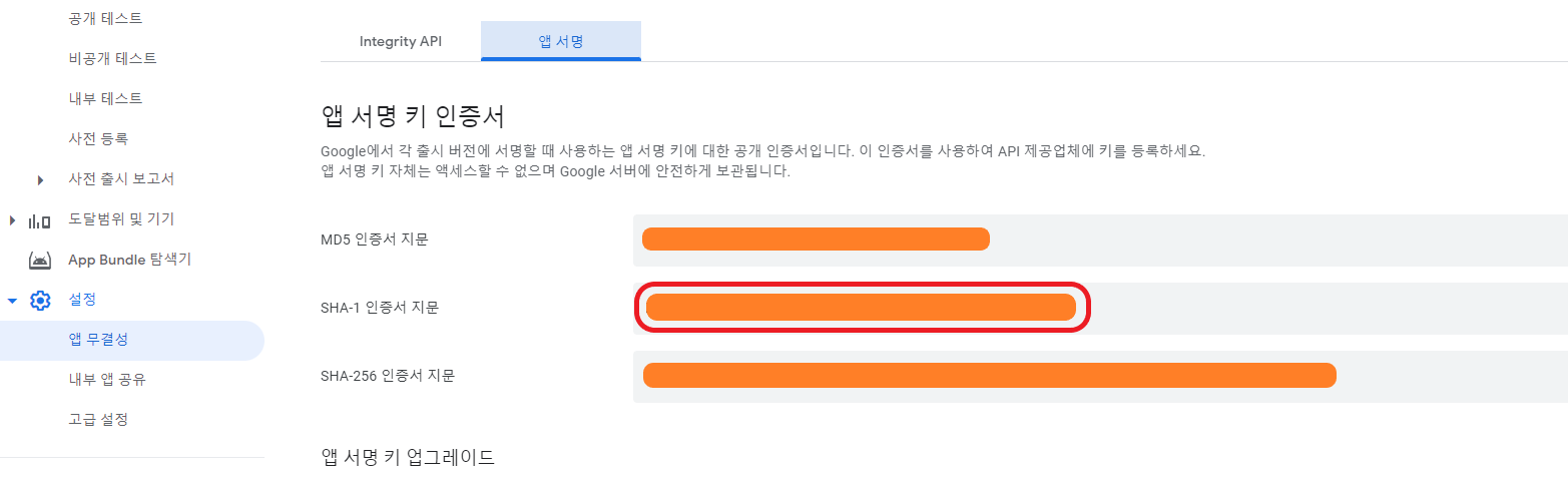 1. [Google Play Console 로그인] > [설정] > [앱 서명 키 인증서] > [SHA-1 인증서 지문] 복사