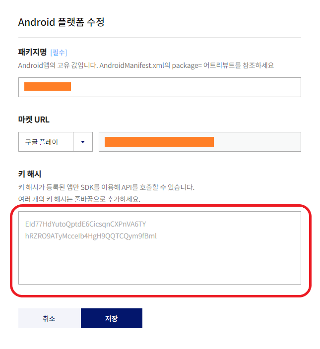 - 발급 받은 키 해시(디버그 키 해시, 릴리즈 키 해시, Google Play Console 앱 서명 키 해시) 등록